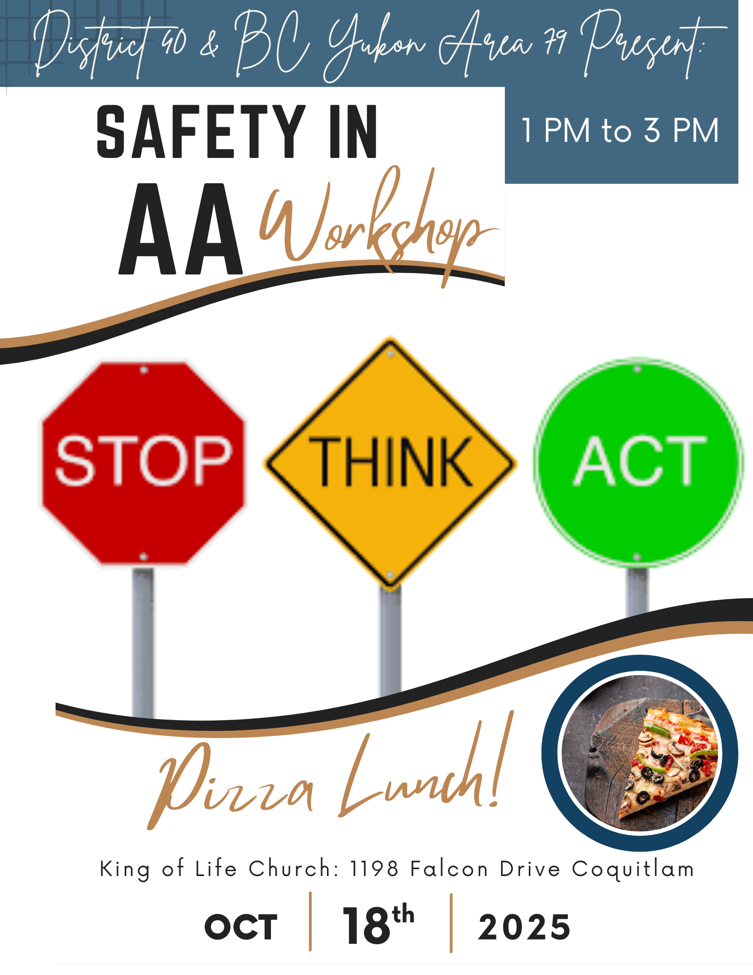 District 40 (Coq, Pt. Coq & Pt. Moody) is hosting a Safety in AA Workshop. The workshop will address a variety of group and individual safety and related questions from AA members, and it will include Pizza!