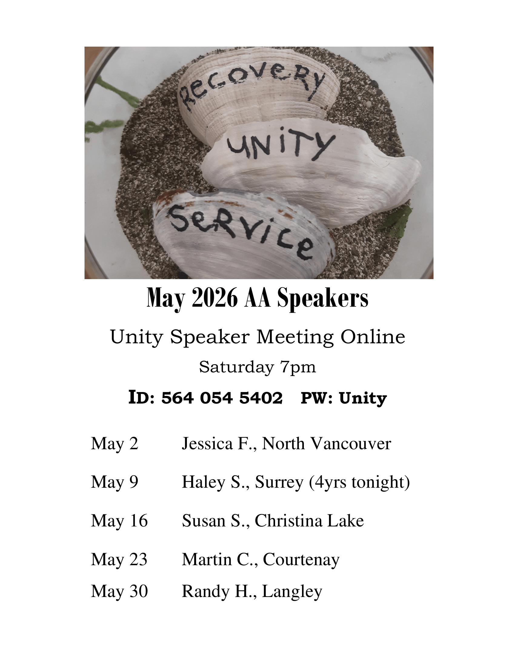 A speaker meeting held online every Saturday at 7:00 pm Pacific Time. Meeting room opens 6:45 pm Pacific Time. A speaker tells their story for approx. 30 to 45 minutes of what they were like, what happened and what they’re like now.